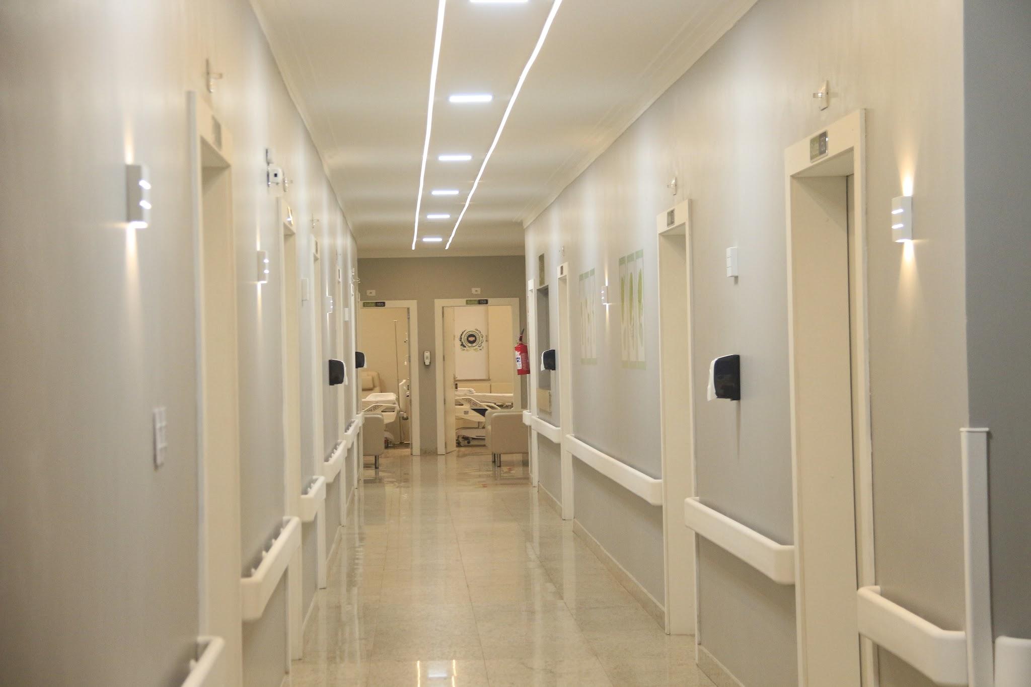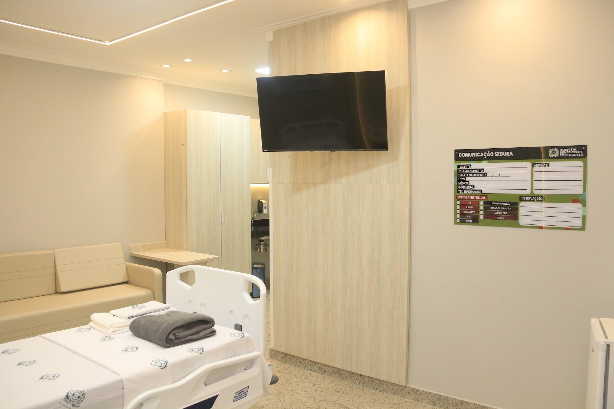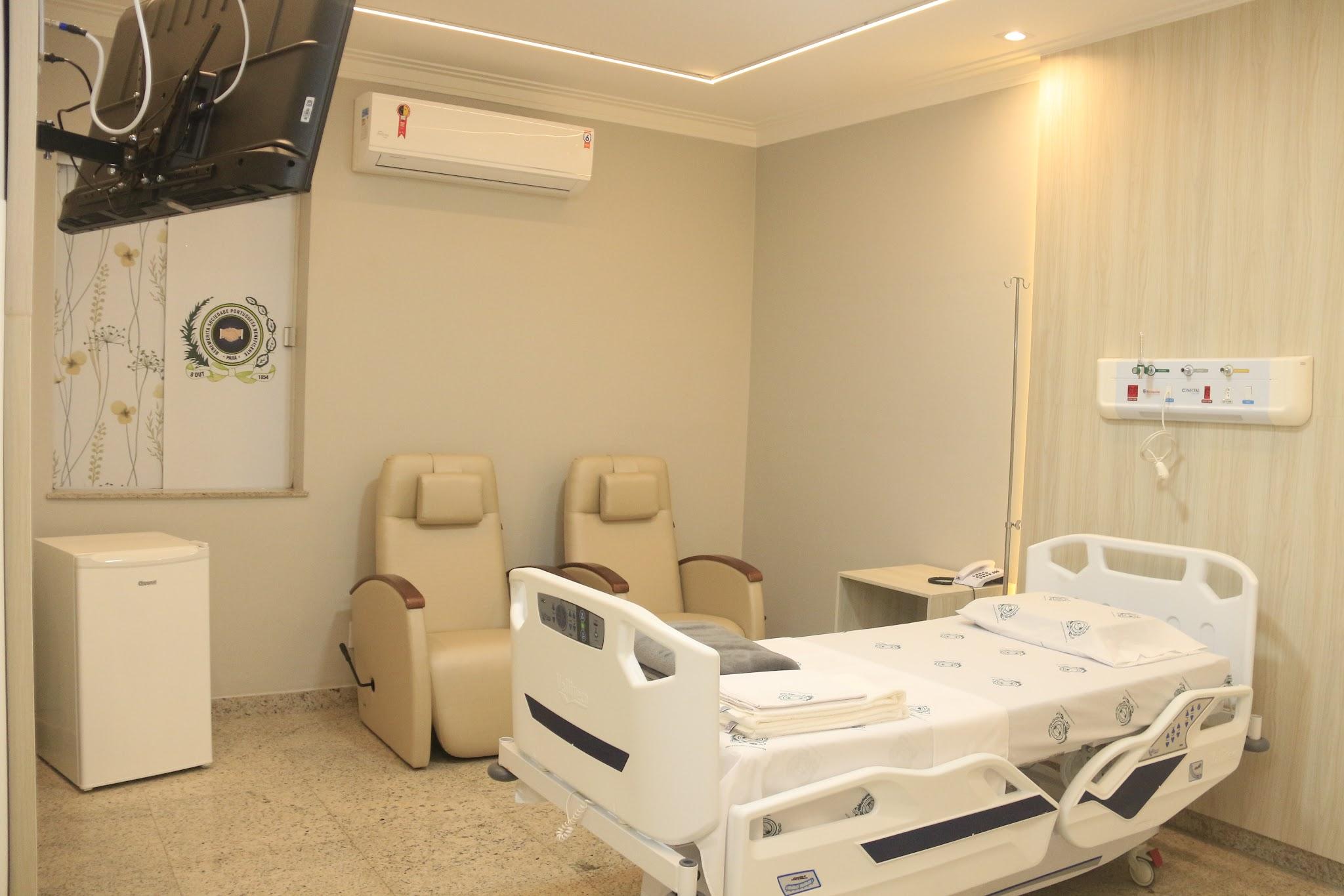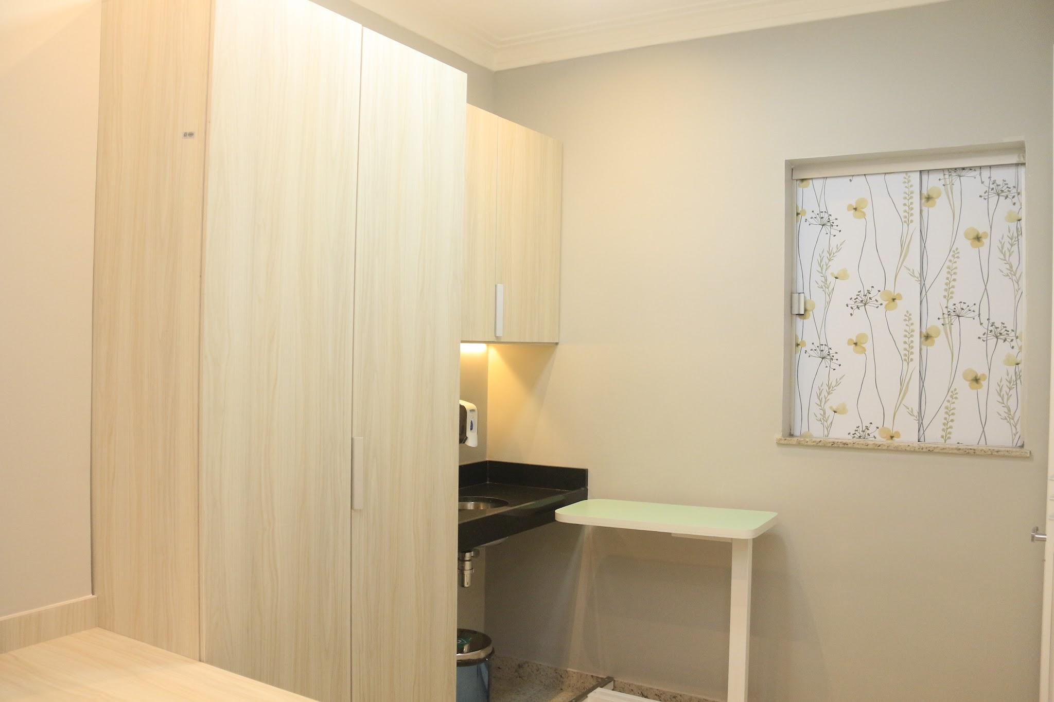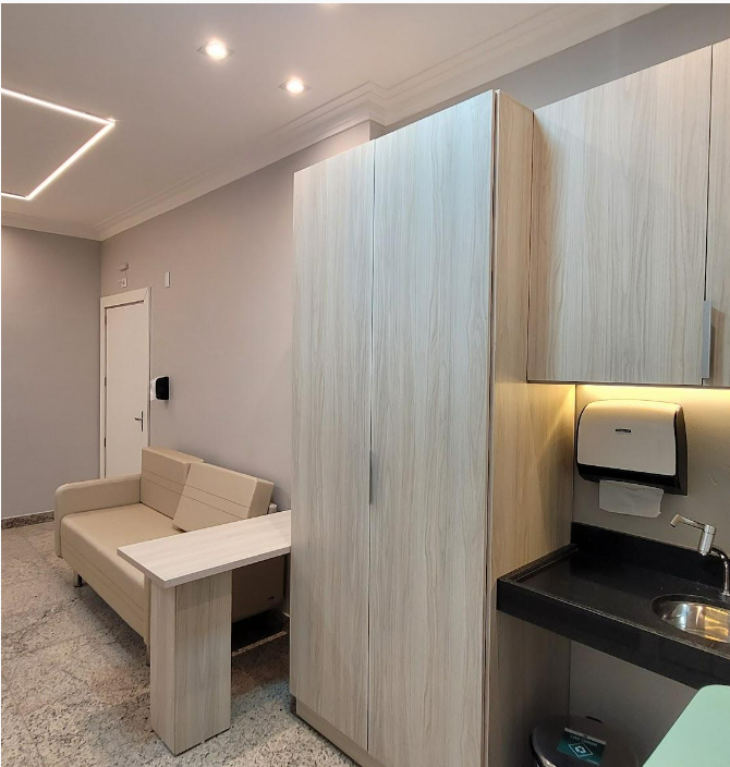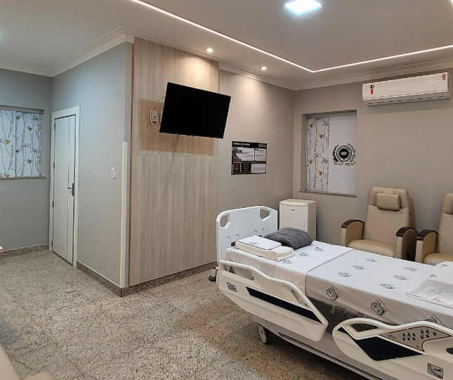 Nossa suíte conta com o design moderno, com cama elétrica, com elevação até 90º de cabeceira, ajustes de tronco, e pernas, poltronas e sofá para acompanhante, televisão, ar-condicionado, frigobar, guarda-roupa, luzes de Led por toda instalação, Wi-Fi, um banheiro totalmente equipado, com chuveiro elétrico, barras de apoio, sanitário ergonomico.